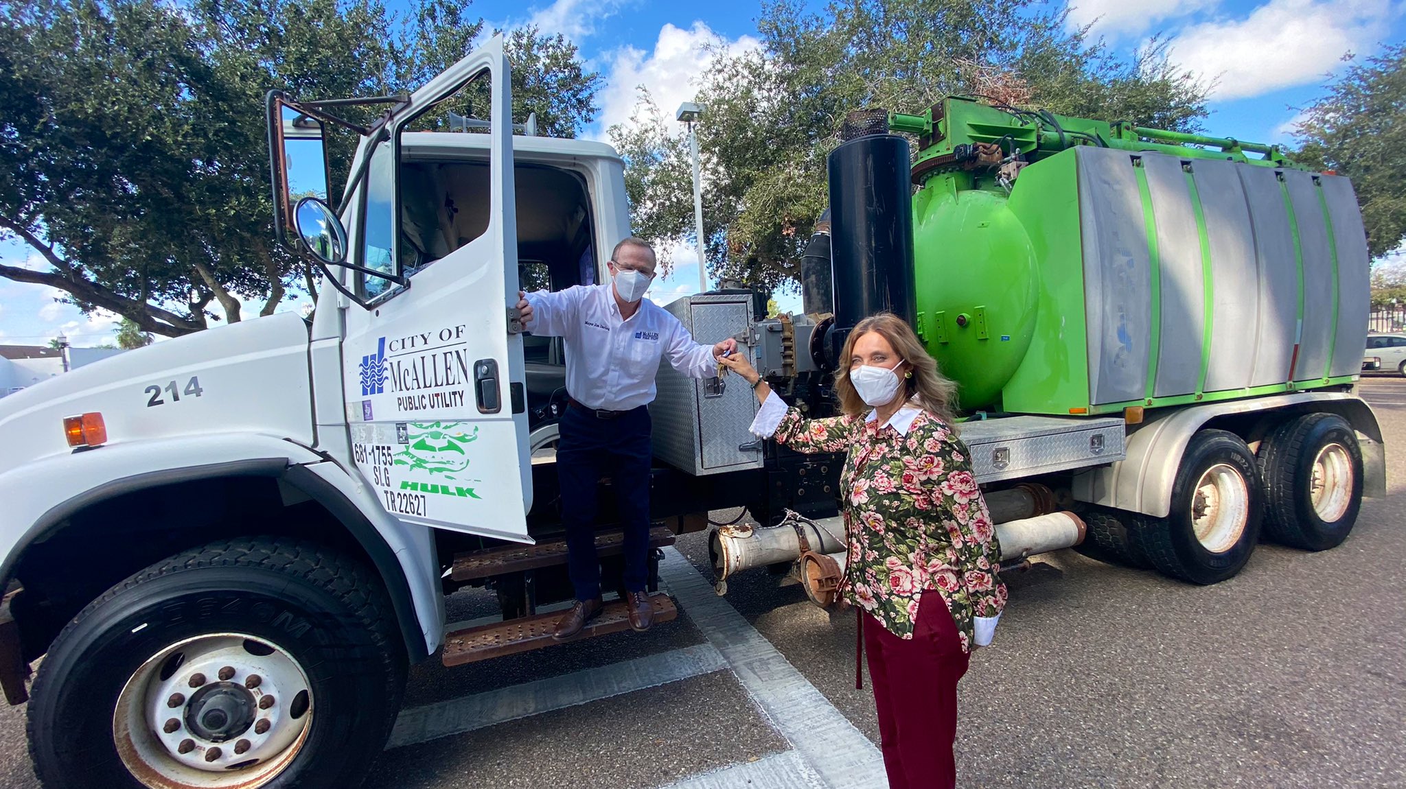 McAllen Public Utility Department and Trustees donate Vacuum Truck to Sister City of Reynosa, rather than sending to auction. Truck cleans up wastewater, debris, unplugs sewer lines and can vacuum approximately 2k gallons of water.